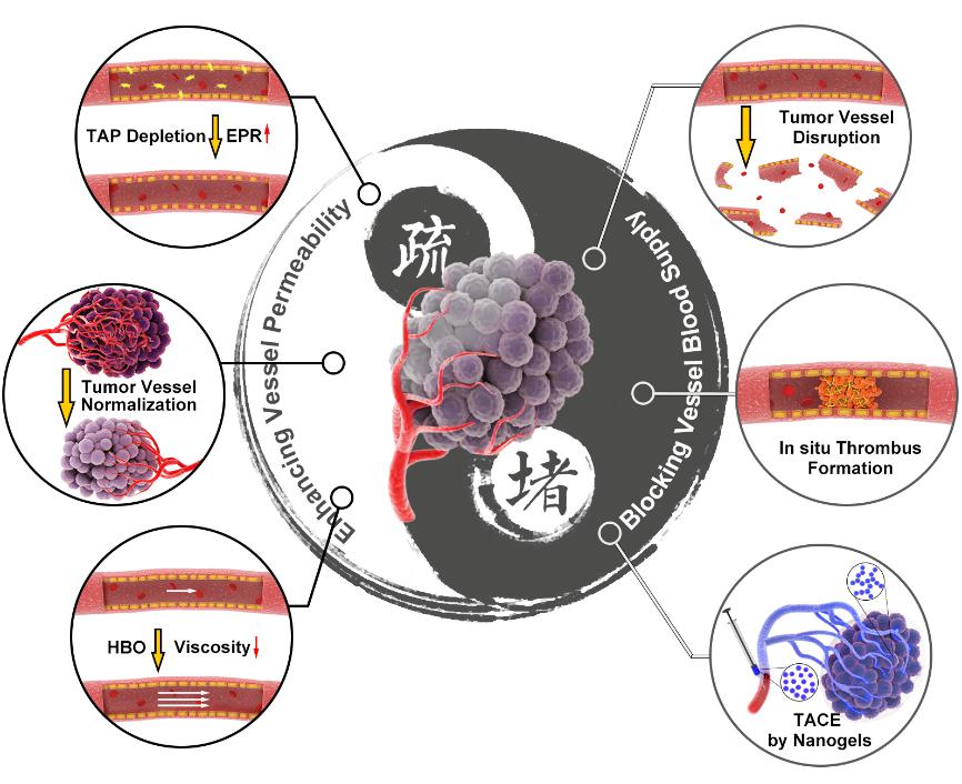 Based on previous work of Professor Xiangliang Yang and Professor Guangjun Nie from National Center for Nanoscience and Technology of China, this review paper proposes seemingly contradictory strategies for the regulation of tumor vasculature: blocking and dredging. The purpose of blocking is to cut off the supply of nutrition and oxygen to cancer cells, whereas the aim of dredging is to improve the delivery efficiency and efficacy of antitumor drugs. The team of Professor Xiangliang Yang developed a smart polymeric nanogel for permanent and peripheral embolization of liver tumors and leveraged hyperbaric oxygen (HBO) therapy to decrease the viscosity and promote tumor perfusion of a nanomedicine. To selectively block tumor blood supply and starve the tumor to death, the team of Professor Guangjun Nie developed a thrombin loaded DNA nanorobots and tumor acidity responsive nanoparticle. In addition, this team constructed a hybrid nanoparticle to selectively deplete tumor associated platelets and prepared tumor acidity responsive nanotherapeutics to correct tumor vasculature abnormalities, for the purpose of enhanced tumor vessel permeability. These six strategies have all achieved remarkable anti-tumor effects.