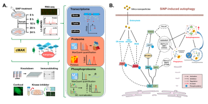 图A. 本研究项目的研究流程示意图;图B. 二样化硅纳米材料激活自噬的分子调控模型图