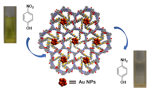 张春教授课题组通过后修饰策略,将含硫基团引入到共价有机框架材料,成功构建了粒径分布窄的金纳米颗粒的共价有机框架材料。金纳米颗粒在共价有机框架基底上分布均匀,粒径均一,对硝基苯酚表现出良好的还原催化活性以及催化稳定性。该研究结果为发展高效、稳定的金属纳米颗粒非均相催化剂奠定基础。