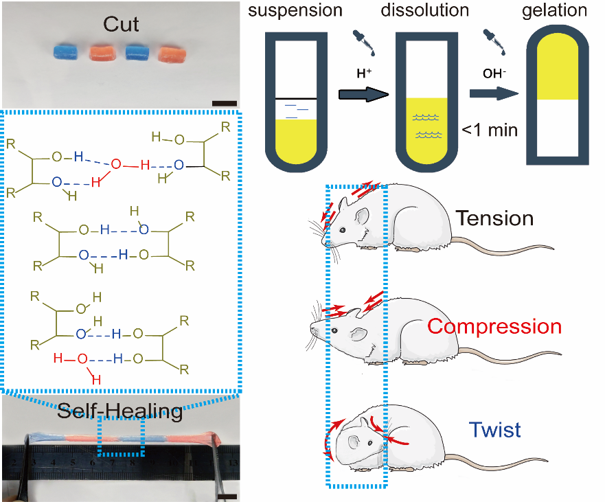 皮肤受到创伤时,通常不能及时愈合,愈合不良会导致功能损失甚至死亡,伤口敷料对于伤口的愈合是必须的。人体的活动部位如膝盖、手腕、脚踝、和颈部的皮肤创伤由于伤口界面频繁的运动,通常会导致愈合不良。在这些部位使用普通的伤口敷料如纱布,需要经常更换,往往会导致二次损伤和愈合时间延长,产生更厚的角质层和瘢痕,影响后期活动能力。自愈合水凝胶似乎能够解决这些问题。在小幅度运动时,凝胶的柔性能保持敷料的完整性;在大幅度运动时,凝胶的自愈合能力能够实现快速地自我修复,延长了敷料的使用时间。但是已报道的自愈合凝胶体系大部分需要复杂的合成过程或者引入有潜在毒性的交联剂,限制了自愈合凝胶的应用。此外,常见的动物伤口模型,都是利用鼠的背部区域,很少有考虑到频繁运动对于伤口的影响,不利于活动部位伤口的在体评价。