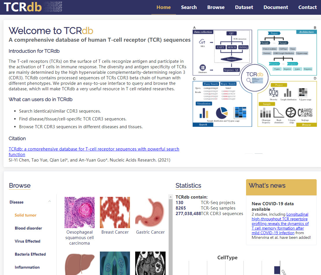 (通讯员 谢贵燕)9月30日,国际权威学术期刊《核酸研究》(Nucleic Acids Research) 在线发表了​必威西汉姆联官网郭安源教授团队开发的目前最大规模的T细胞受体序列数据库。该论文题目为“TCRdb: a comprehensive database for T-cell receptor sequences with powerful search function”。郭安源教授及其博士后雷倩博士为共同通讯作者,​必威西汉姆联官网博士生陈思义和硕士生岳涛为共同第一作者。