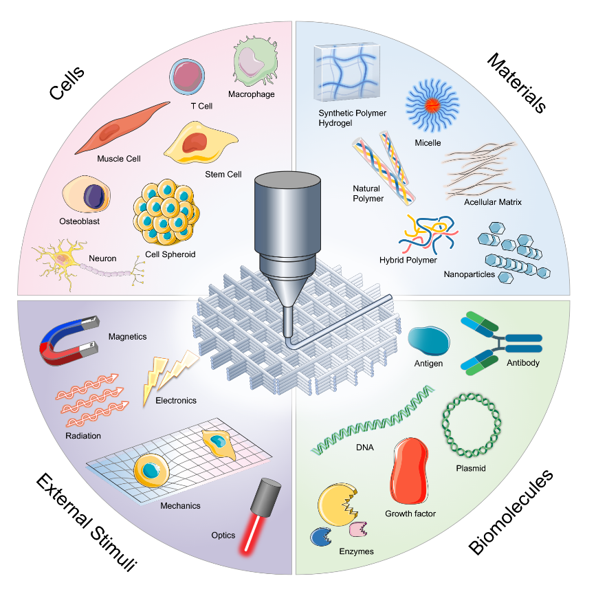 图2.生物打印可通过打印材料的创新,结合细胞、生物分子以及组织工程第四要素——物理刺激,实现下一代组织工程新途径