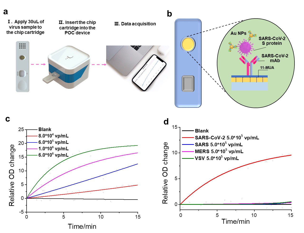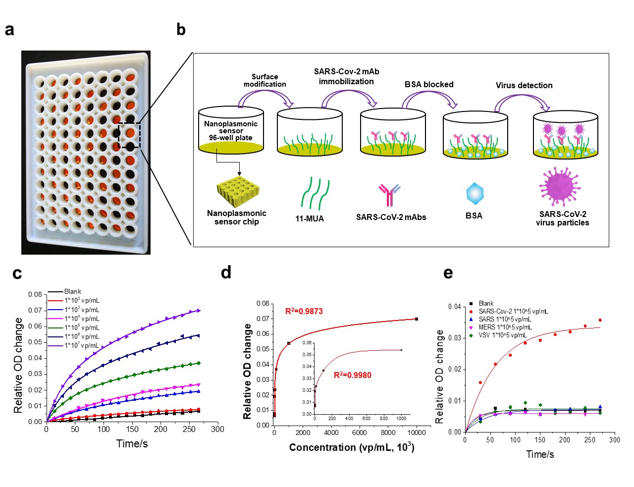 2. a自制纳米等离子光学传感芯片微孔板示意图b芯片修饰与病毒检测示意图;c新冠病毒颗粒定量检测动态曲线变化图;(d新冠病毒颗粒定量检测标准曲线图;e新冠病毒颗粒检测的特异性验证图;