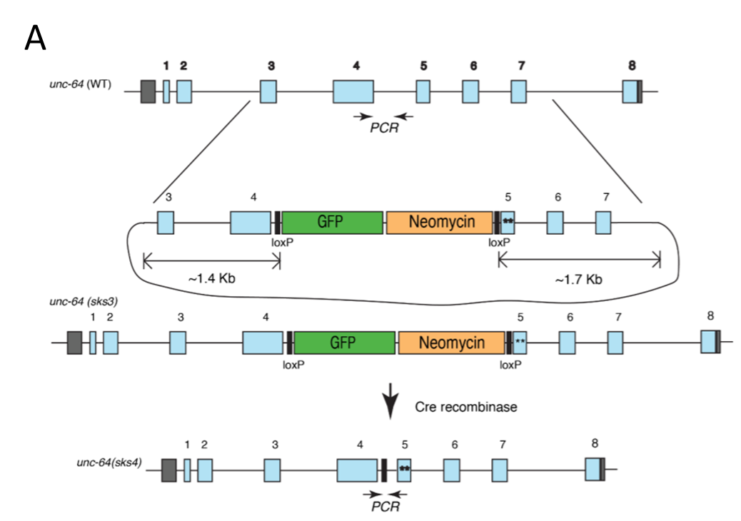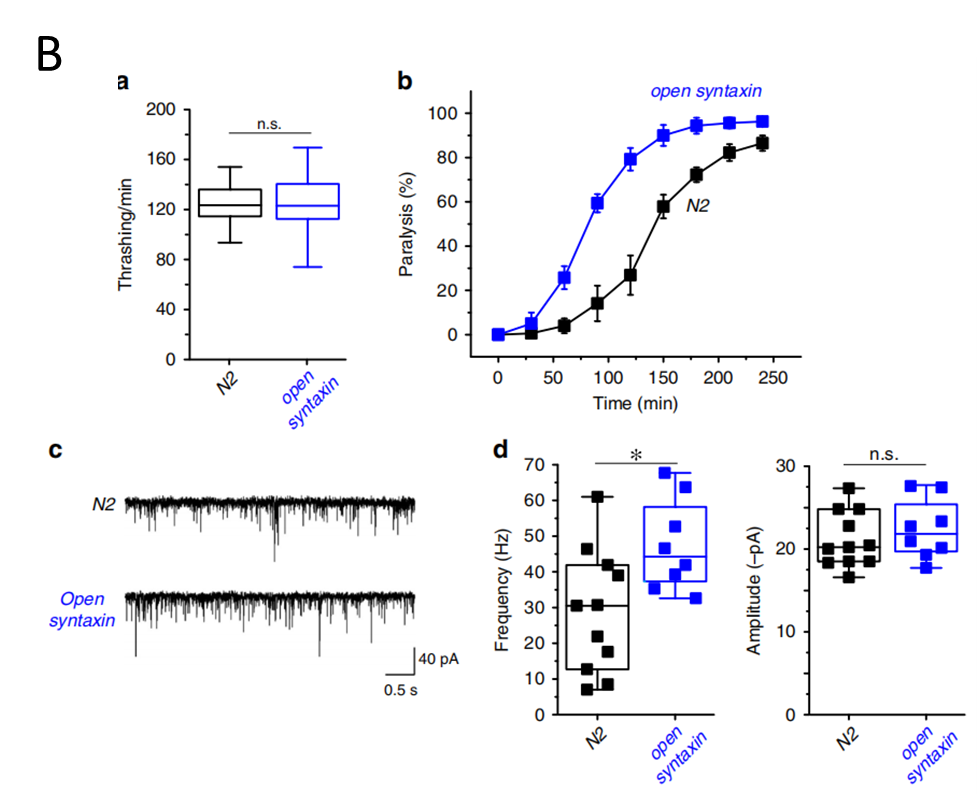Syntaxin/UNC-64是关键的诱导蛋白,对SNARE复合体组装和递质释放至关重要。静息时,syntaxin处于封闭构象并与Munc-18 (syntaxin binding protein) 形成紧密结合。突触兴奋后,SNARE 复合物的组装需要打开syntaxin 的“封闭”构象。换句话说,开放构象的syntaxin是复合体组装关键一步。在线虫 (C. elegans) 中多拷贝过表达开放构象的UNC-64/syntaxin特异拯救UNC-13/Munc13囊泡分泌缺陷,提示UNC-13/Munc13在打开syntaxin过程中具有某种特殊功能 (Richmond et al., 2001)。但强烈的多拷贝过表达可能引入非生理性差异,并且开放构象的syntaxin到底如何与其他突触囊泡分泌调控蛋白互作,均未确切知晓。