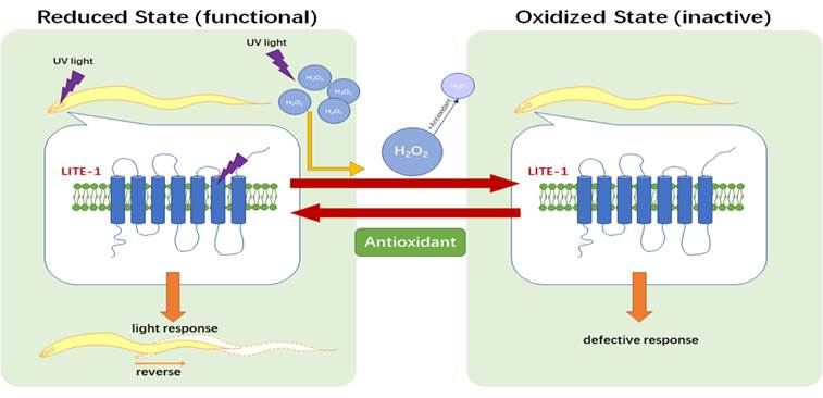 图:过氧化氢和抗氧化剂调控LITE-1活性的模式图