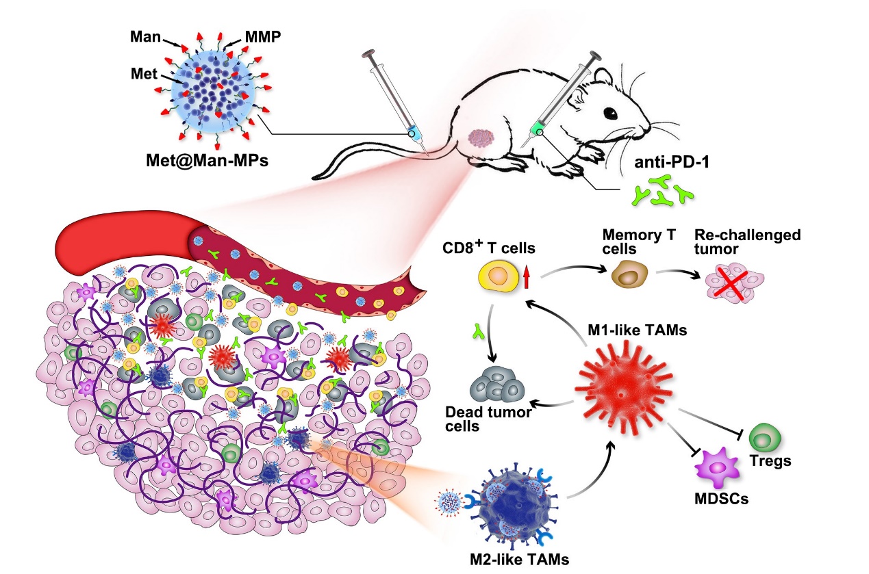 M2型TAMs在促进肿瘤生长、血管新生、肿瘤转移及免疫逃逸等方面发挥重要作用。该研究利用巨噬细胞具有天然的肿瘤靶向性及M2型TAMs高度表达甘露糖受体的特点,构建了甘露糖(Mannose, Man)修饰的巨噬细胞来源微颗粒(Microparticles, MPs)并负载二甲双胍(Metfromin, Met)。此载药微颗粒(Met@Man-MPs)能有效靶向肿瘤M2型TAMs,促进M2型TAMs逆极化成具有抗肿瘤活性的M1型,有效抑制肿瘤生长。Met@Man-MPs能有效改善肿瘤免疫微环境,利用其逆极化成M1型TAMs分泌的细胞因子TNF-α等促进CD8+ T细胞的招募,并降低MDSCs、Tregs等细胞数量;更重要的是Met@Man-MPs携带有巨噬细胞来源的基质金属蛋白酶(Matrix Metalloproteinases,MMPs),能有效降解肿瘤胞外基质,增加CD8+ T细胞向肿瘤组织深部浸润、以及PD-1抗体在肿瘤组织的富集和深部穿透。在多种荷瘤动物模型抗肿瘤实验中均证实Met@Man-MPs能有效改善PD-1抗体的治疗效果,并形成长期的抗肿瘤免疫记忆。该研究为改善PD-1抗体治疗效果提供了新的策略。