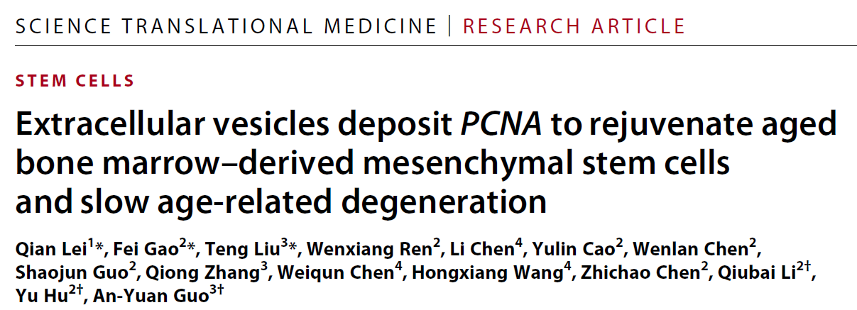 1. Lei Q, et al. Extracellular vesicles deposit PCNA to rejuvenate aged bone marrow–derived mesenchymal stem cells and slow age-related degeneration. Science Translational Medicine. 2021 Jan 27; 13(578): eaaz8697