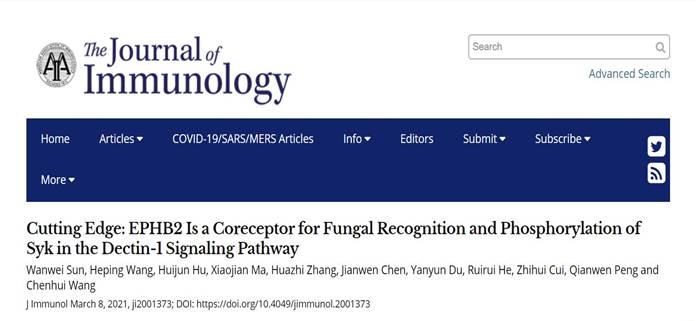 (通讯员 孙万伟)3月9日,必威西汉姆联官网必威西汉姆联官网王晨辉教授团队在国际免疫学权威期刊《免疫学杂志》(The Journal of Immunology)的Cutting Edge版面发表题为“EPHB2 Is a Coreceptor for Fungal Recognition and Phosphorylation of Syk in the Dectin-1 Signaling Pathway”的研究论文。