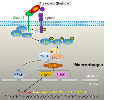 我们的进一步研究发现TAGAP的相互作用蛋白EPHB2是一个新的识别真菌的共受体,而且其对于抗真菌信号通路中Syk分子的激活至关重要。通过分子机制的研究,我们发现EPHB2直接识别真菌细胞壁成分β-glucan,并与dectin-1协同激活了下游信号传递。另外,我们发现EPHB2对于下游激酶Syk的磷酸化激活至关重要。在EPHB2敲除的细胞中,真菌刺激的Syk磷酸化几乎完全丧失。最后,我们通过EPHB2敲除小鼠验证了其在抗真菌免疫中发挥得重要作用。该研究主要有两个创新点:1)鉴定了哺乳动物细胞表面一个新的识别真菌的受体;2)解决了一个长期以来困扰该领域的问题,即Syk是如何被激活的。