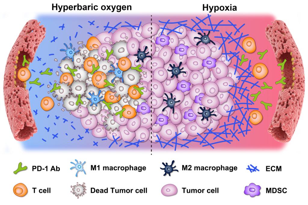 肿瘤免疫治疗,尤其是免疫检查点阻断治疗,近年来受到了广泛关注。PD-1/PD-L1是一类重要的免疫检查点,普遍被肿瘤细胞利用诱导T细胞失能从而避免被免疫系统清除造成免疫逃逸。目前已获批上市的PD-1 抗体有默沙东(Merck)的Keytruda、百时美施贵宝(BMS)的Opdivo、赛诺菲(Sanofi)和再生元(Regeneron)联合研发的Libtayo以及江苏恒瑞医药的Camerlizumab。但是,这些PD-1 抗体药物的临床应用与其他免疫检查点阻断剂一样,遇到了一个巨大瓶颈——总体响应率低,尤其是在肝细胞癌、三阴性乳腺癌、胰腺导管腺癌等恶性实体瘤中。这些恶性实体瘤在发生发展过程中,由于肿瘤细胞的快速增殖、血管发育不完全、分布不均一而导致其内部氧气等供应不足,造成肿瘤乏氧并诱导HIF-1α大量表达。肿瘤乏氧会进一步诱导肿瘤的发展与侵袭转移,调控肿瘤力学微环境与免疫微环境,严重降低肿瘤组织对免疫治疗的响应性,导致治疗失败,因此改善肿瘤乏氧对于增强肿瘤治疗效果意义重大。高压氧治疗(HBO)是指间歇性地在高于正常大气压条件下给予病人纯氧治疗,是一种有效改善组织乏氧的治疗方式。鉴于此,本研究创造性的将高压氧与免疫检查点阻断剂PD-1抗体联合用于实体瘤免疫治疗,发展了HBO赋能PD-1抗体免疫治疗新策略。本研究通过小鼠肝癌皮下瘤、肝癌原位瘤、乳腺癌原位瘤、胰腺癌原位瘤以及肝癌临床样本等多种模型验证了高压氧增强PD-1抗体肿瘤免疫治疗的有效性、安全性以及普适性。结合转录组与多种肿瘤模型揭示高压氧可以显著改善实体瘤乏氧,降低细胞外基质中胶原蛋白与纤连蛋白的含量,从而有效改善实体瘤力学微环境,促进PD-1抗体在实体瘤中的穿透与富集,并提高CD8+ T细胞在实体瘤内部的浸润。高压氧联合PD-1抗体在改善肿瘤乏氧的同时,降低肿瘤内部骨髓来源抑制性细胞的量,提高M1型巨噬细胞/M2型巨噬细胞的比例,调控多种细胞因子的量,使得肿瘤微环境由免疫抑制性向免疫刺激性转变。