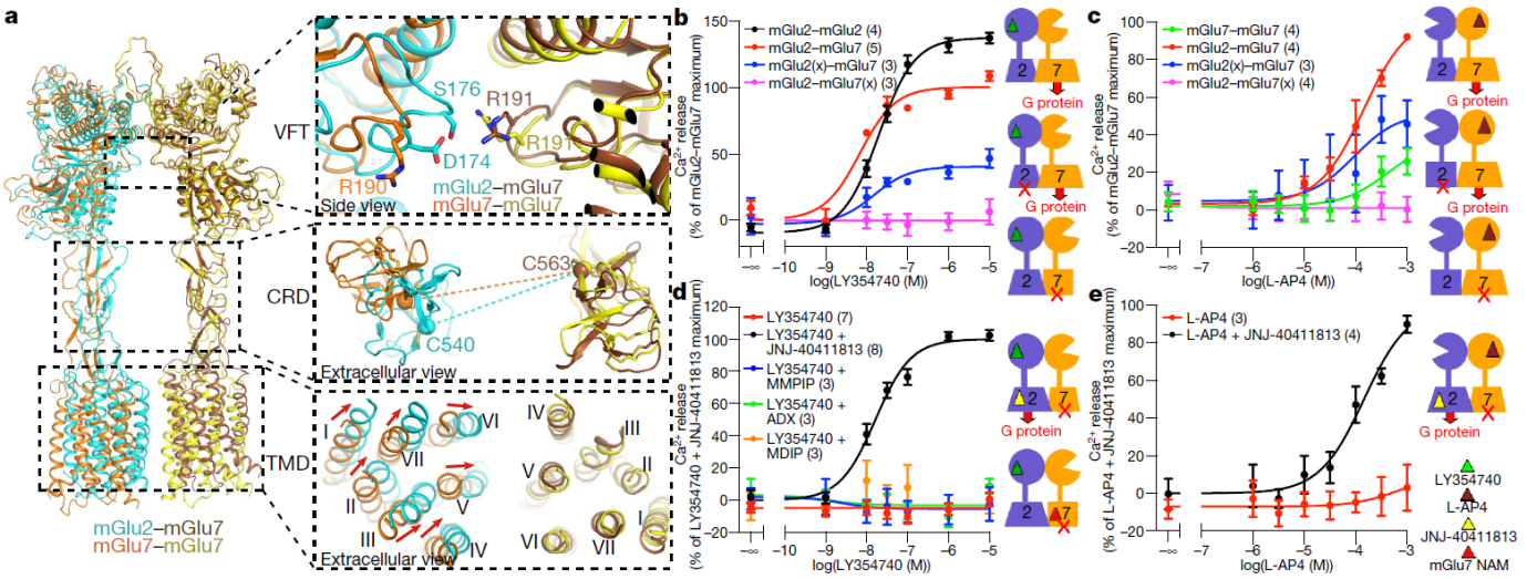 代谢型谷氨酸受体(Metabotropic glutamate receptor, mGlu)和γ-氨基丁酸B型受体(GABAB)都属于C类G蛋白偶联受体(G protein-coupled receptor, GPCR)家族,是人体内最重要的神经递质受体之一。目前在人体内共发现了8种代谢型谷氨酸受体(mGlu1-8),其功能涉及学习、记忆、情绪以及疼痛感知等,是阿尔兹海默症和精神分裂症等疾病的治疗靶点。然而,迄今尚无靶向这类受体的药物成功上市,因此其结构与功能研究对精神神经系统疾病的新药创制具有重要意义。与其它类型的GPCR相比,mGlu和GABAB等C类GPCR具有独特的激活机制。GABAB形成异源二聚体,mGlu不仅可以形成同源二聚体,也可以形成异源二聚体。但是,长期以来对mGlu异源二聚体的调控机制并不清楚,限制了以之为靶点的特异性药物开发。
