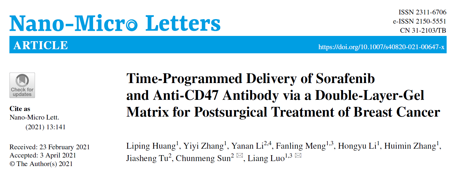 (通讯员:张一漪)在最新一期出版的纳微米技术领域国际旗舰期刊《Nano-Micro Letters》(IF=16.4)中,刊发了必威西汉姆联官网必威西汉姆联官网、国家纳米药物工程技术研究中心罗亮教授团队与中国药科大学孙春萌副教授团队合作的题为“Time‑Programmed Delivery of Sorafenib and Anti‑CD47 Antibody via a Double‑Layer‑Gel Matrix for Postsurgical Treatment of Breast Cancer”的研究论文。该论文报道了一种新型的可注射双层凝胶实现肿瘤化疗药物与免疫治疗药物贯序释放用于乳腺癌术后治疗。