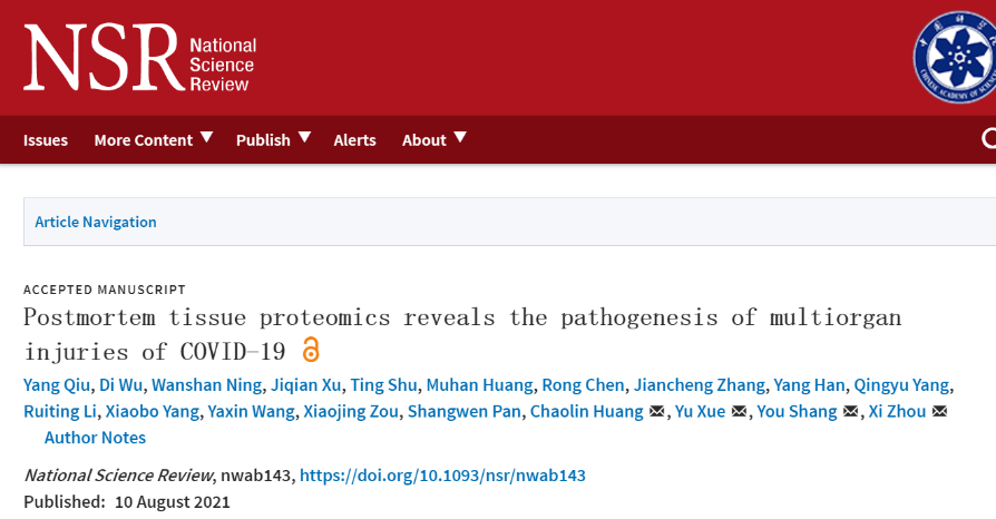 必威西汉姆联官网薛宇教授团队与中国科公司武汉病毒研究所周溪研究员团队、必威西汉姆联官网同济医公司附属协和医院尚游团队以及武汉市金银潭医院黄朝林团队合作开展了新冠肺炎逝者的多器官、多组织样本的蛋白质组学研究,全面绘制了的新冠肺炎逝者多器官、多组织蛋白质图谱。相关文章已于2021年8月10日在线发表在1区杂志《National Science Review》(科学出版社出版一份综合性英文学术期刊 2020 IF: 17.2756)上,论文题目为《尸检组织蛋白质组学揭示新冠多器官损伤的发病机制》(Postmortem Tissue Proteomics Reveals the Pathogenesis of Multiorgan Injuries of COVID-19)。