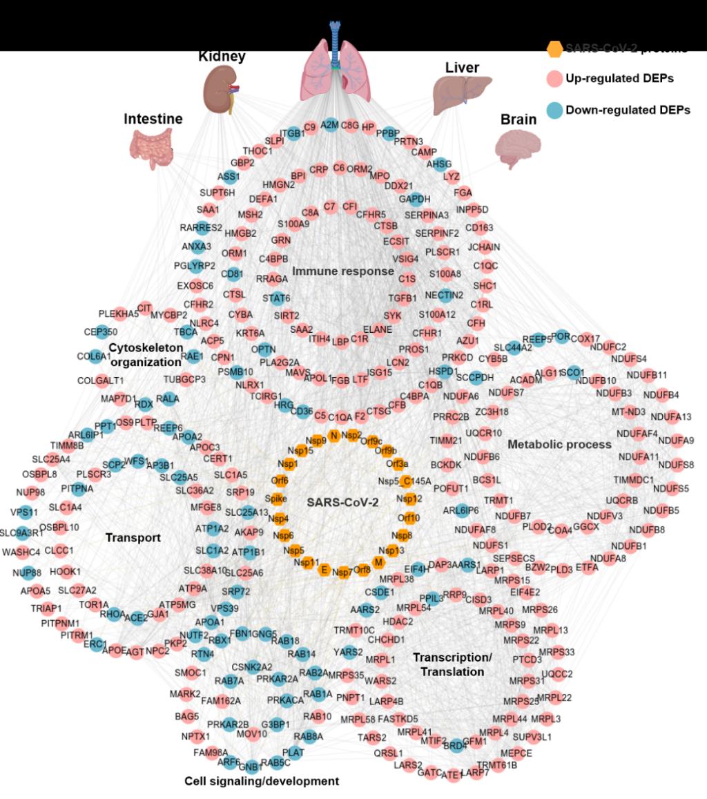 在本项研究中,研究人员通过对新冠肺炎逝者的肺、肝脏、肠、肾脏、脾脏、脑、心脏和肌肉进行定量蛋白质组学分析,发现了大量与器官损伤相关的蛋白质变化。其中,肺器官包含了最丰富的蛋白质变化,这些蛋白质主要与免疫/炎症等生物学过程相关。除肺以外,其他器官/组织也表现出显著的蛋白质变化,这些蛋白质主要与器官运作、呼吸和代谢等生物学过程相关。这些结果表明肺损伤的主要原因是过度炎症反应所致的血管内血栓形成和肺结构/功能破坏,而其他器官/组织损伤主要表现为缺氧和功能障碍。因此,我们的研究结果阐明了与新冠肺炎多器官损伤相关的宿主蛋白/通路的病理生理变化,揭示了新冠肺炎多器官损伤的发病机制。