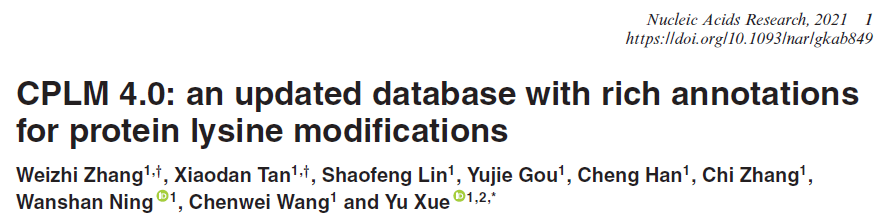2021年9月29日,公司必威西汉姆联官网薛宇教授团队开发了第四版赖氨酸修饰数据库,于国际期刊《核酸研究》 (Nucleic Acids Research)在线发表了题为 “CPLM 4.0: an updated database with rich annotations for protein lysine modifications” 的论文。论文共同第一作者为张玮之和谭潇丹,通讯作者为薛宇教授。