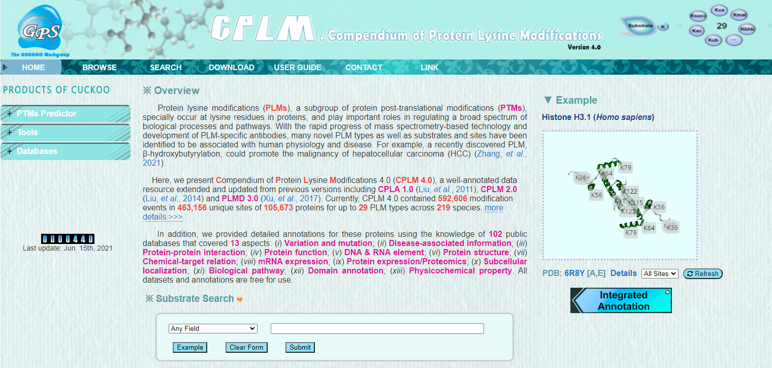 赖氨酸修饰是一种十分重要的蛋白质翻译后修饰,它通过将修饰小分子共价结合到底物蛋白的特定赖氨酸位点上,来影响生物体内的多种生物学过程。例如发生在组蛋白上的乙酰化 (Acetylation)和甲基化 (Methylation)能够作为组蛋白密码来影响转录调控和基因表达。同样的,发生在非组蛋白上的赖氨酸修饰则被报导与细胞信号转导,蛋白质活性调控及蛋白质运输等功能密切相关。随着针对蛋白质翻译后修饰研究技术的进展,越来越多的赖氨酸位点被鉴定,更丰富的赖氨酸修饰类型被发现,譬如2019年发现的组蛋白赖氨酸新修饰,乳酸化 (Lactylation),就被证明与癌症发展相关。将这些重要的赖氨酸修饰类型及位点囊括进数据库有助于研究者们对赖氨酸修饰获得一个更为全面的了解。
