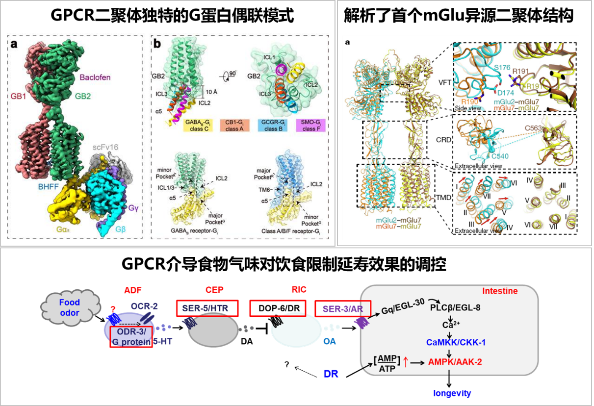 G蛋白偶联受体(GPCR)是重要的药物靶点。刘剑峰教授团队揭示了GPCR二聚体独特的G蛋白结合模式和非对称激活机制,打破了GPCR研究领域里一段时间以来已经广为认可的GPCR与G蛋白结合范式。同时,还发现了GPCR参与食物气味感知神经系统调节饮食限制延寿过程的新机制,为抗衰老研究及药物开发开拓了新的方向。