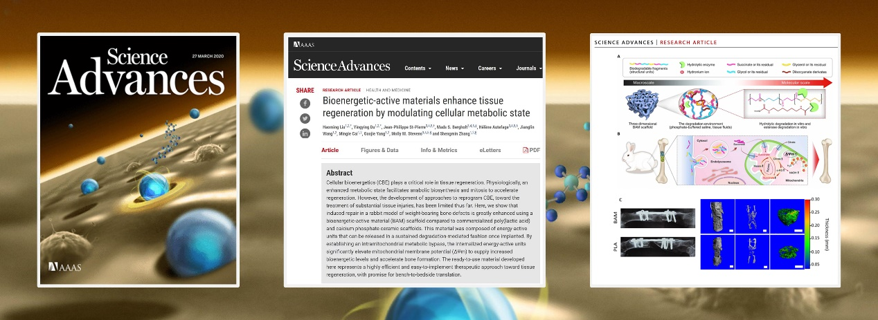 张胜民教授团队在国际上原创提出并命名了一类新的生物能量活性材料(Bioenergetic-active Materials, BAM),拥有中国和美国完全自主知识产权授权,展示了生物材料与再生医学新的地平线。其重大创新和突破之处在于,新材料降解产物可利用缺损部位细胞作为“生物反应器”in situ产生ATP,在无需任何生长因子的条件下加速骨组织再生,具有重要临床转化前景。