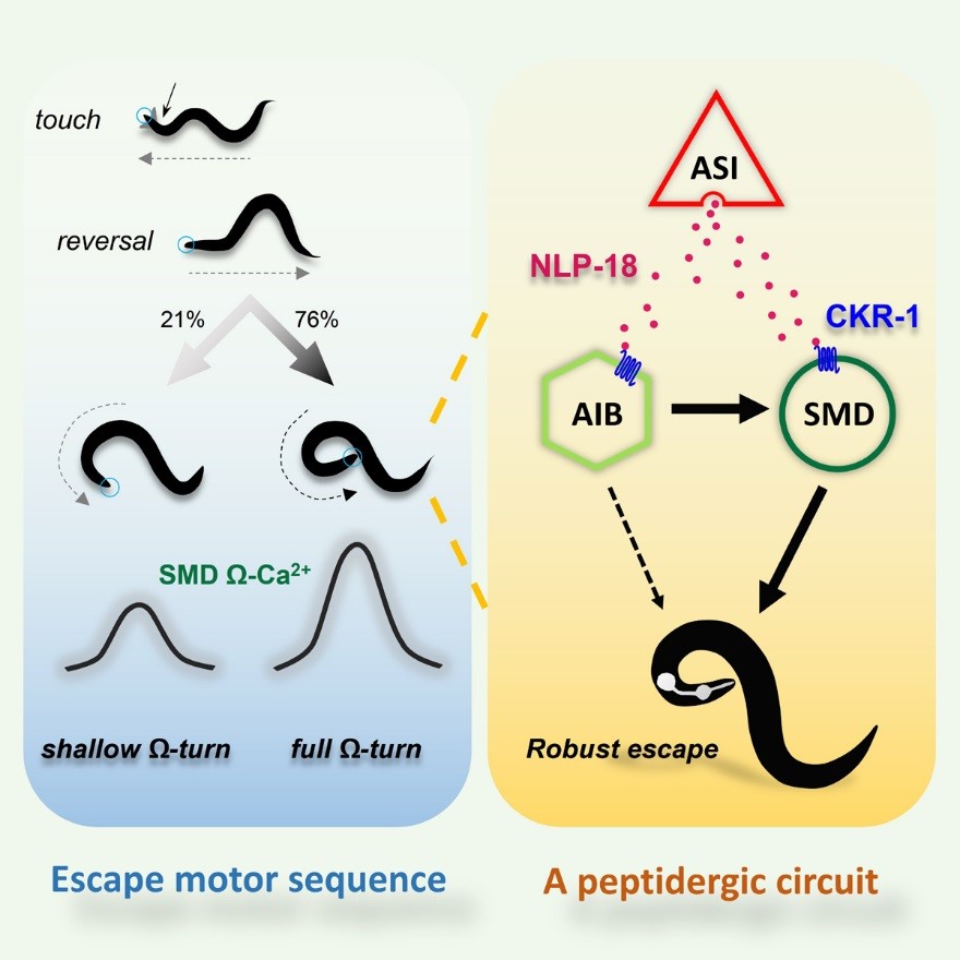 该研究以线虫受到强伤害性刺激时表现出的快速后退、转向、再前进的逃避运动序列,为实验范式,通过对线虫逃避转向进行精确量化分析,发现线虫逃避伤害刺激时伴随的几乎180°的转向(robust steering)运动,需要激活胆囊收缩素信号通路。转向调节需要的神经肽NLP-18由味觉感受神经元ASI释放,激活下游头部运动神经元SMD和中间神经元AIB上的胆囊收缩素样受体CKR-1。实时追踪自由逃避转向时的SMD神经元钙活动,证明NLP-18-CKR-1信号通路可以增强线虫在转向时SMD神经元的钙活性,从而为头部肌肉提供更强的动力完成180°转向 (full Ω-turn)。(图1)