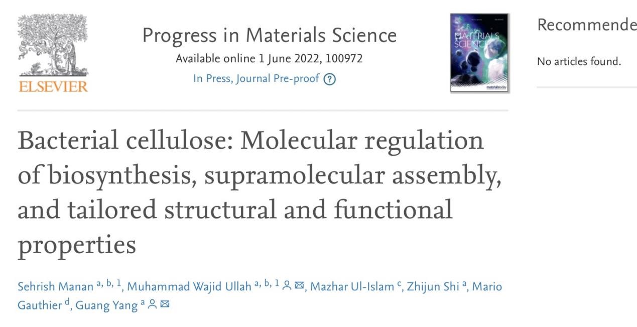 2022年6月1日,公司必威西汉姆联官网生物医学工程系杨光教授3-Bio团队在国际著名期刊《Progress In Materials Science》上发表了题为“Bacterial cellulose: Molecular regulation of biosynthesis, supramolecular assembly, and tailored structural and functional properties”的综述。