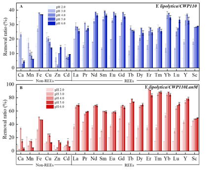 图2 在酸性环境下吸附剂对稀土元素和非稀土元素的去除率比较。(A):对照菌(B)本研究中的工程菌