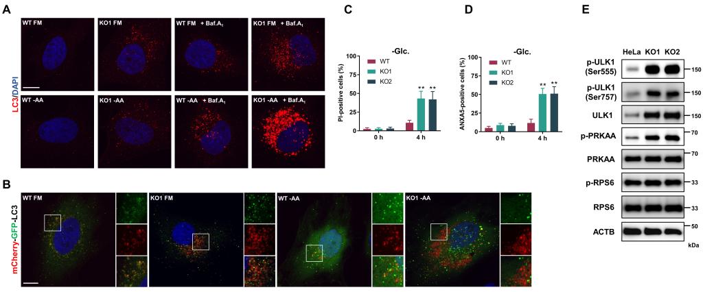 首先,该研究发现RAB21基因敲除会导致细胞自噬流显著升高,且自噬体的清除(与溶酶体融合)效率也大幅提升。然而,提升的自噬流并不能增强细胞耐受饥饿等不良环境的能力,反而使细胞在各种应激条件下更快发生凋亡。通过这一反常现象,作者发现自噬上游的重要调控分子AMPK显著活化,并通过磷酸化其底物ULK1(参与自噬体形成的重要分子)导致自噬流升高。