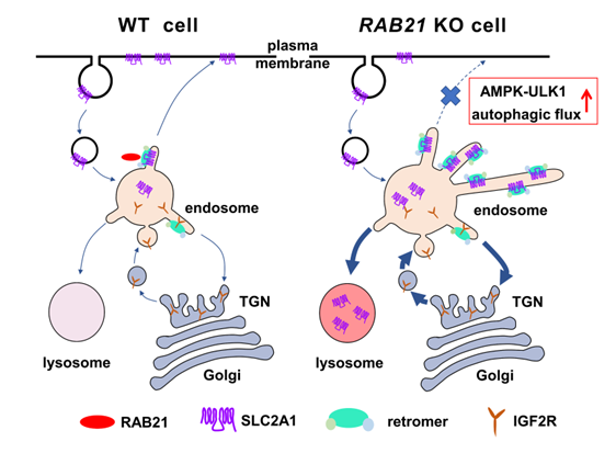 全文总结:在野生型细胞中,retromer复合体在RAB21的参与下介导细胞膜受体(如SLC2A1等)的逆向回膜运输,确保细胞高效摄取葡萄糖。RAB21缺失导致retromer介导形成的分选小管无法与早期內吞体解离,破坏SLC2A1的逆向回膜运输过程,继而影响细胞对葡萄糖的摄取,最终导致AMPK-ULK1通路的激活和细胞自噬流的升高。这项研究纠正了之前研究者对于RAB21蛋白在细胞自噬中的错误认知,同时为研究内吞体的动态变化和相关的囊泡转运机制提供了新的思路。