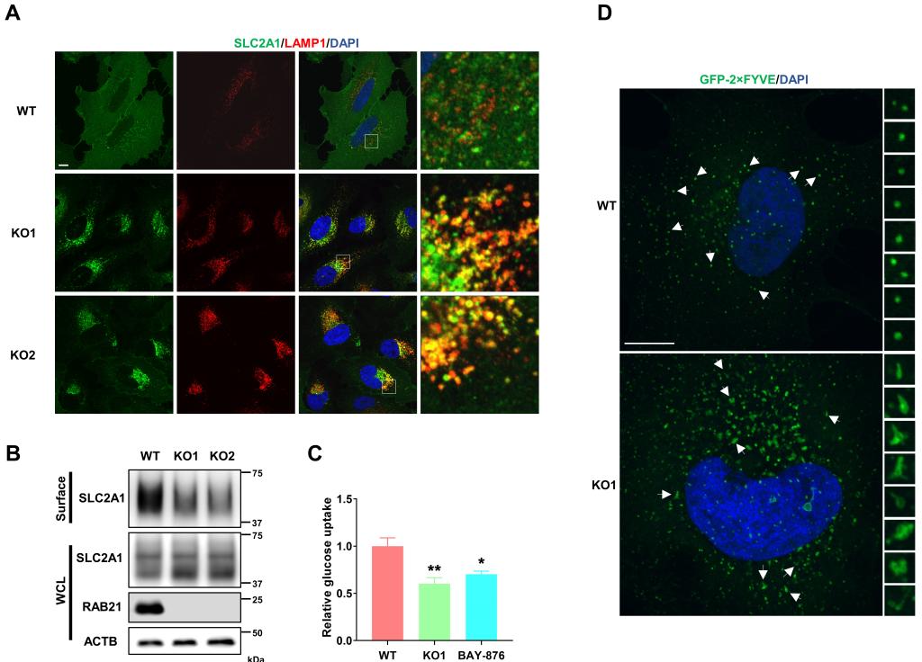 图2:RAB21敲除细胞中SLC2A1逆向运输受阻,细胞膜表面SLC2A1水平降低,细胞摄取葡萄糖效率降低,早期内吞体形态改变