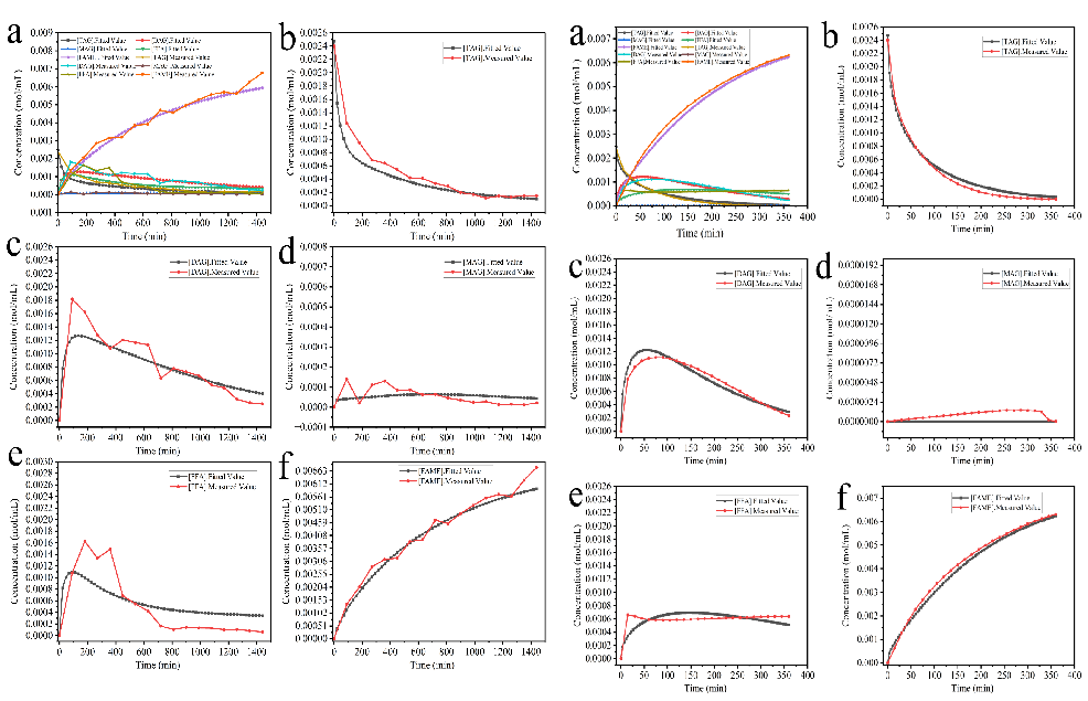 图1. 24 h(左图)和6h(右图)不同反应体系条件下,液态脂肪酶催化生物柴油合成体系的动力学模拟值与实验值的拟合结果