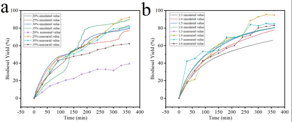 图2. 使用动力学模型对初始含水量(a)及甲醇添加量(b)的预测值与实验值对比