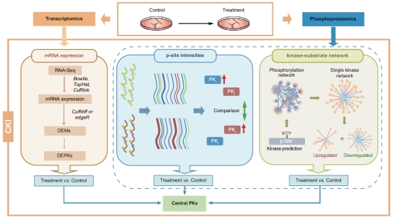 CKI算法的设计包含三个基本假设。首先,蛋白激酶在转录水平的表达调控其固有活性,因此生物学过程中,转录水平显著变化的蛋白激酶可能是重要的。差异表达的蛋白激酶可从转录组数据中计算获得。其次,活性更高的激酶可能修饰更多磷酸化位点,反之亦然。因此可根据磷酸化组数据中的修饰位点变化,反推上游调控激酶的活性变化。第三,活性更高的激酶可能对磷酸化网络有更强的影响,因此可根据磷酸化组数据构建激酶-底物网络,再利用统计学的方法检测活性显著变化的激酶。综合三部分预测,即为CKI算法的最终结果。