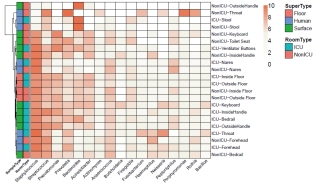 该研究首先分析ICU病房与普通病房在微生物多样性、群落结构方面的差异。接着通过大规模微生物溯源,发现两种病房存在不同的菌群传播模式:对于ICU病房,微生物传播的中心点是床沿;而对于普通病房,微生物更倾向以室内地面作为传播中心。进一步寻找病房内的重要传播链条,结果显示:包含葡萄球菌、链球菌等几种常见病原微生物显示出较高的传播能力。通过筛选标志物、丰度过滤,共挖掘出17个病原微生物属,相关性分析结果表明:环境中的致病微生物对病人存在一定影响,且相比于普通病房,ICU内存在的致病菌对人体的影响更为显著。不仅如此,该结果与不同病房传播模式的特点相吻合,揭示了病房中存在的交叉感染风险。