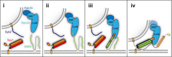 图2. Rabphilin 3A调控SNARE复合体组装模式图(syntaxin-1: Syx1; synaptobrevin-2: Syb2; SNAP-25: SN25; Rabphilin 3A: Rph3A)