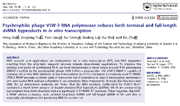2022年10月26日,必威西汉姆联官网​必威西汉姆联官网朱斌教授团队在国际RNA领域著名期刊《核糖核酸生物学》(RNA Biology)发表题为“Psychrophilic phage VSW-3 RNA polymerase reduces both terminal and full-length dsRNA byproducts in in vitro transcription”的研究论文。