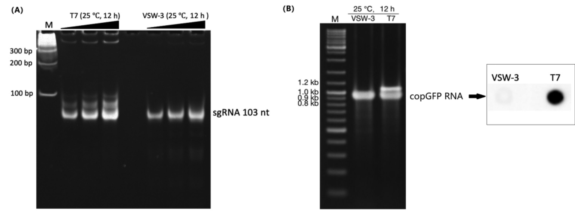 朱斌课题组利用近年来爆发性增长的环境微生物基因组资源报道了新世纪以来所有的新型噬菌体单亚基RNA聚合酶的发现和开发工作,包括Syn5 RNA聚合酶、KP34 RNA聚合酶和VSW-3 RNA聚合酶,已形成国际特色研究方向。其中本研究工作报道的是来自云南香格里拉高原季节性湿地冰湖纳帕海的VSW-3 RNA聚合酶。由于其对RNA和DNA末端结合能力的特点,VSW-3 RNA聚合酶在体外转录中有效降低了T7 RNA聚合酶以RNA为模版的末端延伸和依赖DNA末端的转录起始,因此T7产物中显著存在的末端双链RNA和全长双链RNA在VSW-3产物中几乎检测不到,极大提高了体外合成RNA的纯度,尤其适用于体内应用的RNA如mRNA药物和疫苗。同时VSW-3 RNA聚合酶的低温合成以及对第二类T7转录终止子的不敏感特性进一步提高了RNA合成纯度。