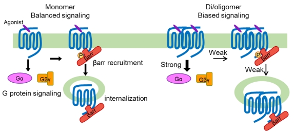 1GPCR通过二聚化和寡聚化产生偏向性信号的示意图