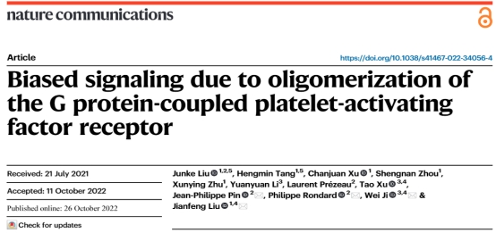 2022年10月26日,​必威西汉姆联官网、教育部分子生物物理重点实验室刘剑峰教授研究团队在Nature杂志子刊《自然·通讯》(Nature Communications)在线发表题为“Biased signaling due to oligomerization of the G protein-coupled platelet-activating factor receptor”(G蛋白偶联的血小板激活因子受体的偏向性信号起因于受体的寡聚化)的研究论文。