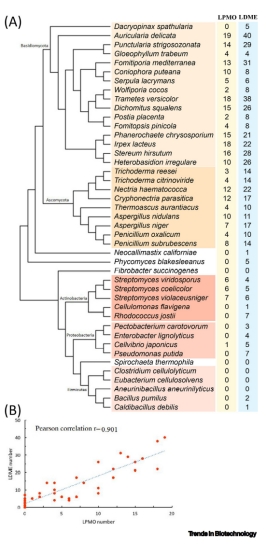 该团队首次证明了裂解性多糖单加氧酶LPMO作为木质素降解辅助酶系通过驱动过氧化物酶反应和增强芬顿反应参与木质素生物降解的途径和机制。本论文也首次通过分析比较不同木质素降解菌基因组,从基因组层面揭示了LPMO与木质素降解-修饰酶之间存在较强的相关性,提出了LPMO与木质素降解-修饰酶存在共进化的可能,为LPMO参与木质素生物降解的功能提供了新的证据。