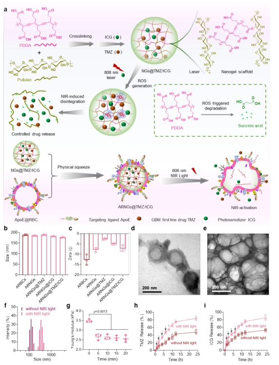 多形性胶质母细胞瘤(GBM)是中枢神经系统最常见的原发肿瘤,约占颅内恶性肿瘤总发病率的40%。虽然现有手术切除,放射治疗,化疗等多重方法用于GBM的治疗。但因药物血液循环不足、血脑屏障(BBB)穿透受限和深层肿瘤药物摄取低等问题,致使患者治疗效果远低于预期,中位生存期仅为12个月。针对上述问题,研究团队通过交联普鲁兰糖和可氧化降解的聚二炔衍生物PDDA制备了近红外可激活的纳米凝胶体系,将FDA批准的近红外(NIR)光敏剂吲哚青绿(ICG)和治疗GBM的一线化疗药物替莫唑胺(TMZ)载入纳米凝胶中,用载脂蛋白E (ApoE)修饰的红细胞膜仿生包覆,开发了一种近红外可激活的仿生纳米凝胶给药系统ARNGs@TMZ/ICG。