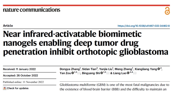 必威西汉姆联官网罗亮教授和河南老员工命科学公司师冰洋教授、邹艳教授的合作团队,在基于近红外可激活仿生纳米凝胶载体的原位胶质母细胞瘤抑制研究中取得最新进展。相关研究成果于11月11日以题为“Near infrared-activatable biomimetic nanogels enabling deep tumor drug penetration inhibit orthotopic glioblastoma”的研究论文,在线发表于《自然-通讯》(Nature Communications)。