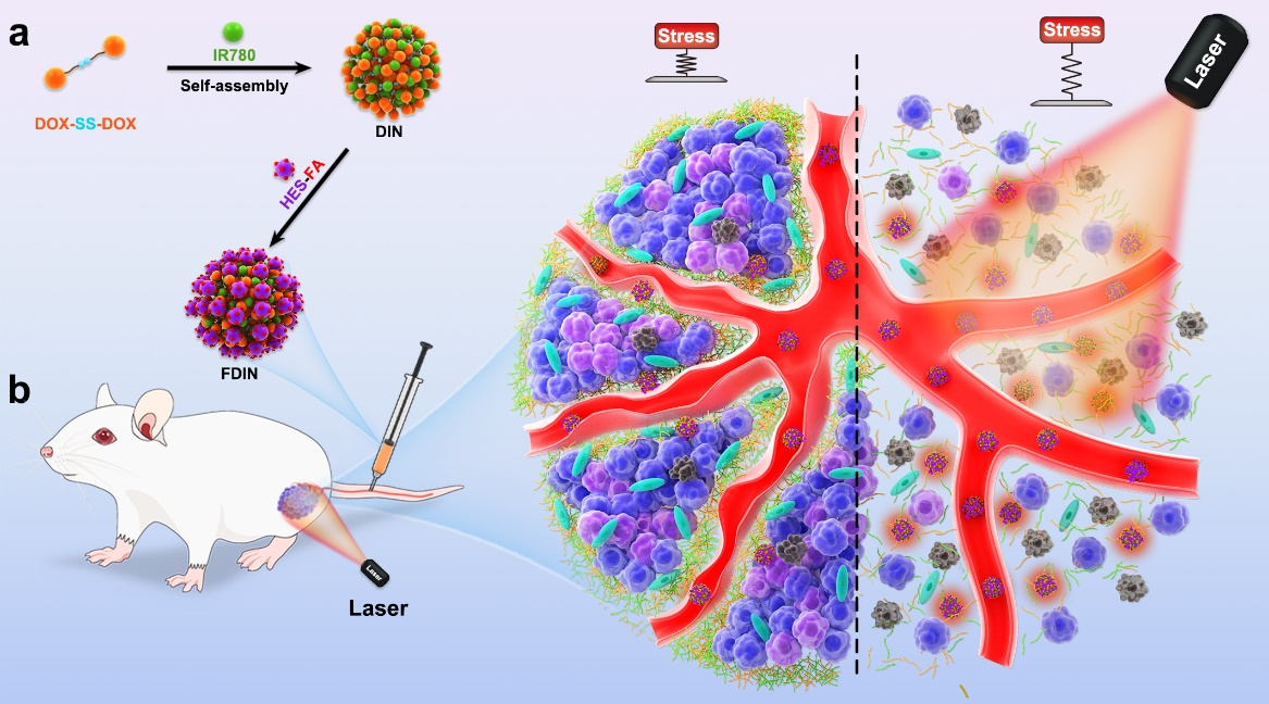 基于以上背景,本研究提出一种通过光热改善肿瘤部位力学微环境,促进药物递送,清除肿瘤干细胞的新策略。一方面,光热直接清除肿瘤相关成纤维细胞及细胞外基质,降低肿瘤硬度、促进肿瘤血管正常化,增加纳米药物在肿瘤组织的蓄积、深部穿透。另一方面,通过缓解乏氧及清除肿瘤相关成纤维细胞来破坏肿瘤干细胞赖以生存的生态位实现清除肿瘤干细胞的目的。基于该策略成功研制出一种具有高载药量的羟乙基淀粉-叶酸聚合物稳定的阿霉素二聚体新型纳米制剂,在三阴性乳腺癌模型中取得显著的抗肿瘤效果。