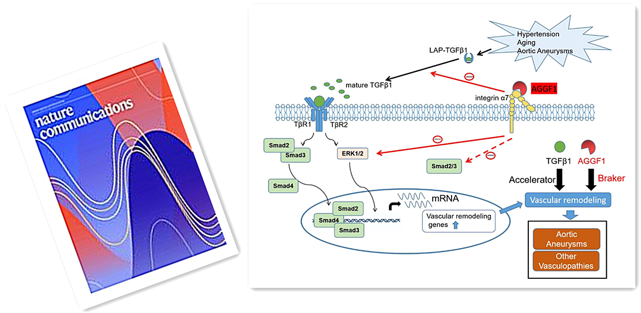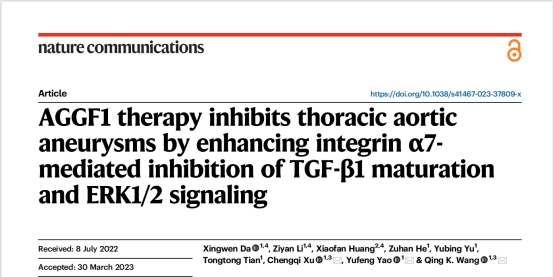 04月20日,国际权威期刊Nature Communications发表了该篇题为“AGGF1 therapy inhibits thoracic aortic aneurysms by enhancing integrin α7-mediated inhibition of TGF-β1 maturation and ERK1/2 signaling”的论文。研究人员提出的AGGF1蛋白质疗法,即腹腔注射纯化的重组AGGF1蛋白质,可以通过阻断动脉扩张和重塑,成功抑制胸主动脉瘤的发生发展。
