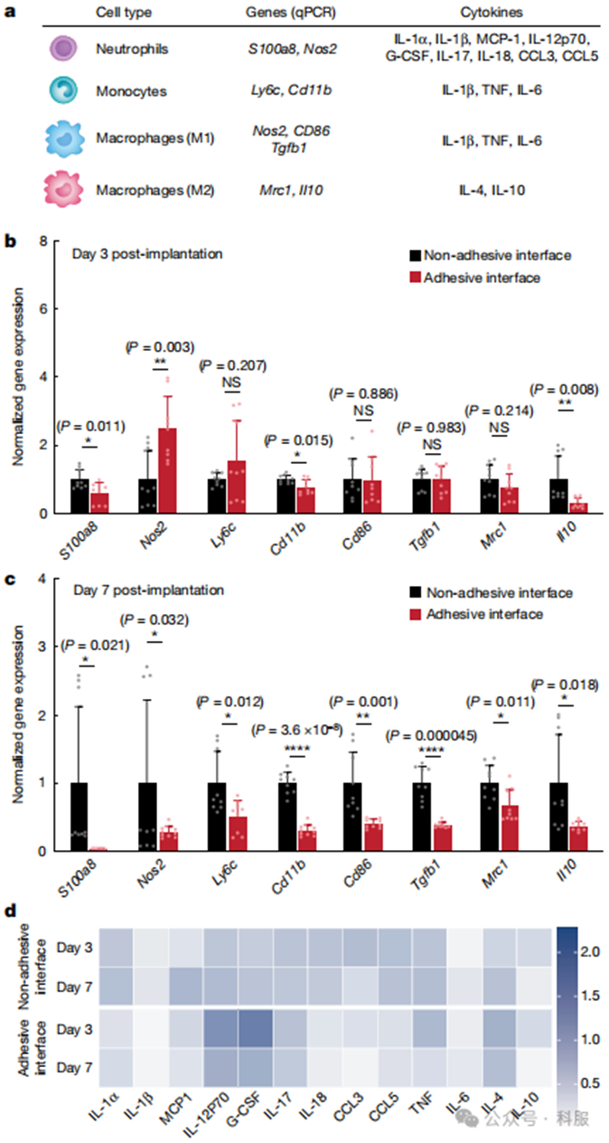 图4. 粘附和非粘附植入物-组织界面的qPCR和Luminex分析