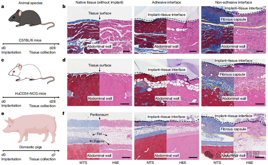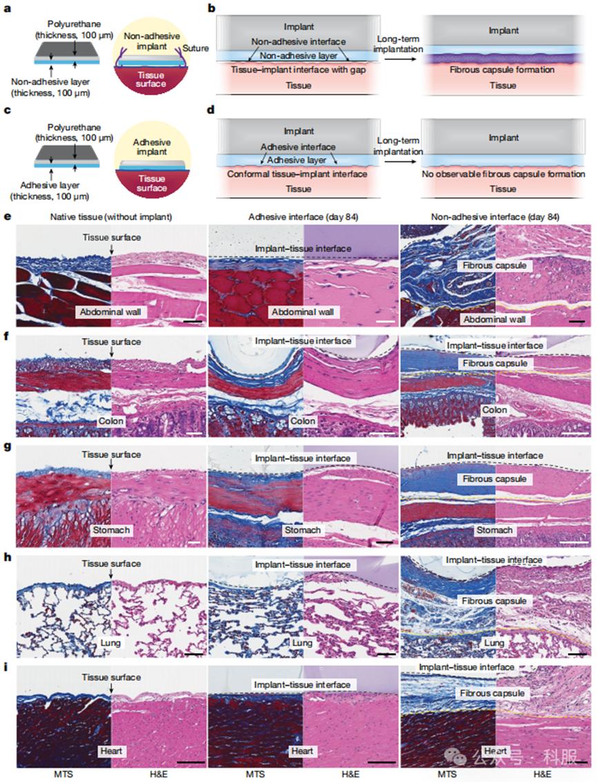 该研究证明,与非粘附性的植入物-组织界面相比,粘附性植入物-组织界面可降低炎性细胞浸润到粘附植入物-组织界面的水平,从而减轻纤维囊在不同动物模型(包括大鼠、小鼠、人源化小鼠和猪)中的形成。组织学分析表明,在体内使用12周后,粘附性植入物-组织界面在腹壁、结肠、胃、肺、心脏等多种器官上均未形成可观察到的纤维囊。此外,还进行了体外蛋白质吸附、多重Luminex测定、定量PCR、免疫荧光分析和RNA测序来验证该假设。还在活体大鼠模型中,利用带黏附界面的植入式电极实现了12周的长期双向电通信。这些研究发现可能为长期抗纤维化的植入物-组织界面提供了一种有前景的策略。