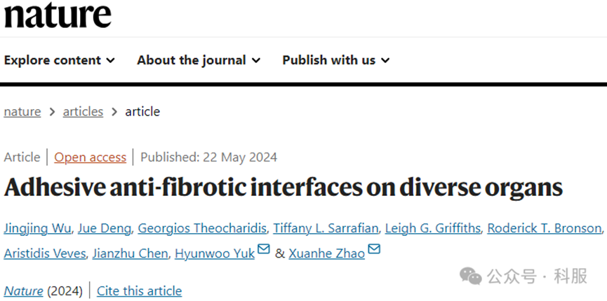 2024年5月22日,美国麻省理工公司机械工程系赵选贺教授团队在Nature期刊发表题为“Adhesive anti-fibrotic interfaces on diverse organs”的研究论文,团队博士后吴晶晶为论文第一作者,Hyunwoo Yuk博士、赵选贺教授为论文共同通讯作者。