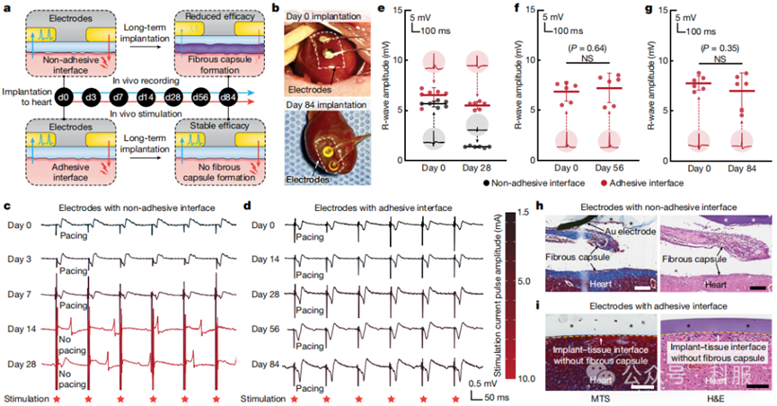 图6. 通过黏附抗纤维化界面进行的长期体内双向电通信