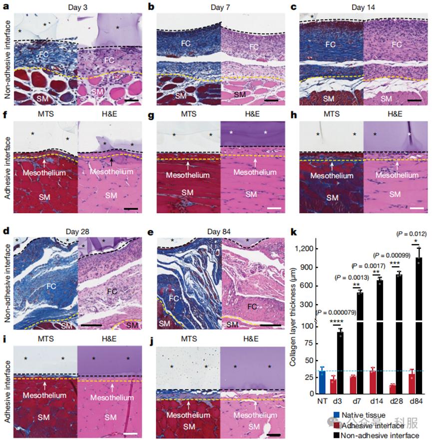 该研究证明了粘合界面不仅可以提供植入物与目标组织的机械整合,还能防止在植入物-组织界面形成可观察到的纤维囊。研究人员认为,黏附植入物与组织表面之间的保形界面整合可以减少炎症细胞(如中性粒细胞、单核细胞、巨噬细胞)浸润到粘附植入物-组织界面的水平,从而导致胶原沉积水平降低,减少纤维囊的长期形成。相比之下,传统的非黏附性植入物通常不能与组织表面形成保形整合,并吸引炎症细胞浸润到非黏附性植入物-组织界面,随后,纤维囊就会在非黏附性植入物-组织界面上形成。