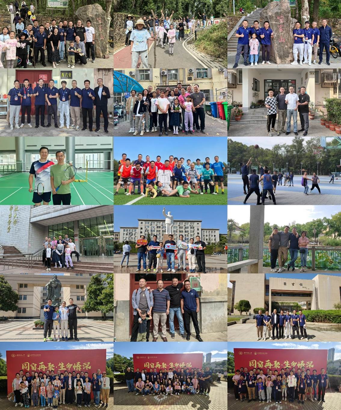 活动期间,同学们相约重登喻家山,探访老宿舍、教学楼,游历校园景点,遍尝食堂餐厅,并与校内老师员工在中心操场组织了友谊篮球赛、足球赛,找寻曾经的青春回忆。