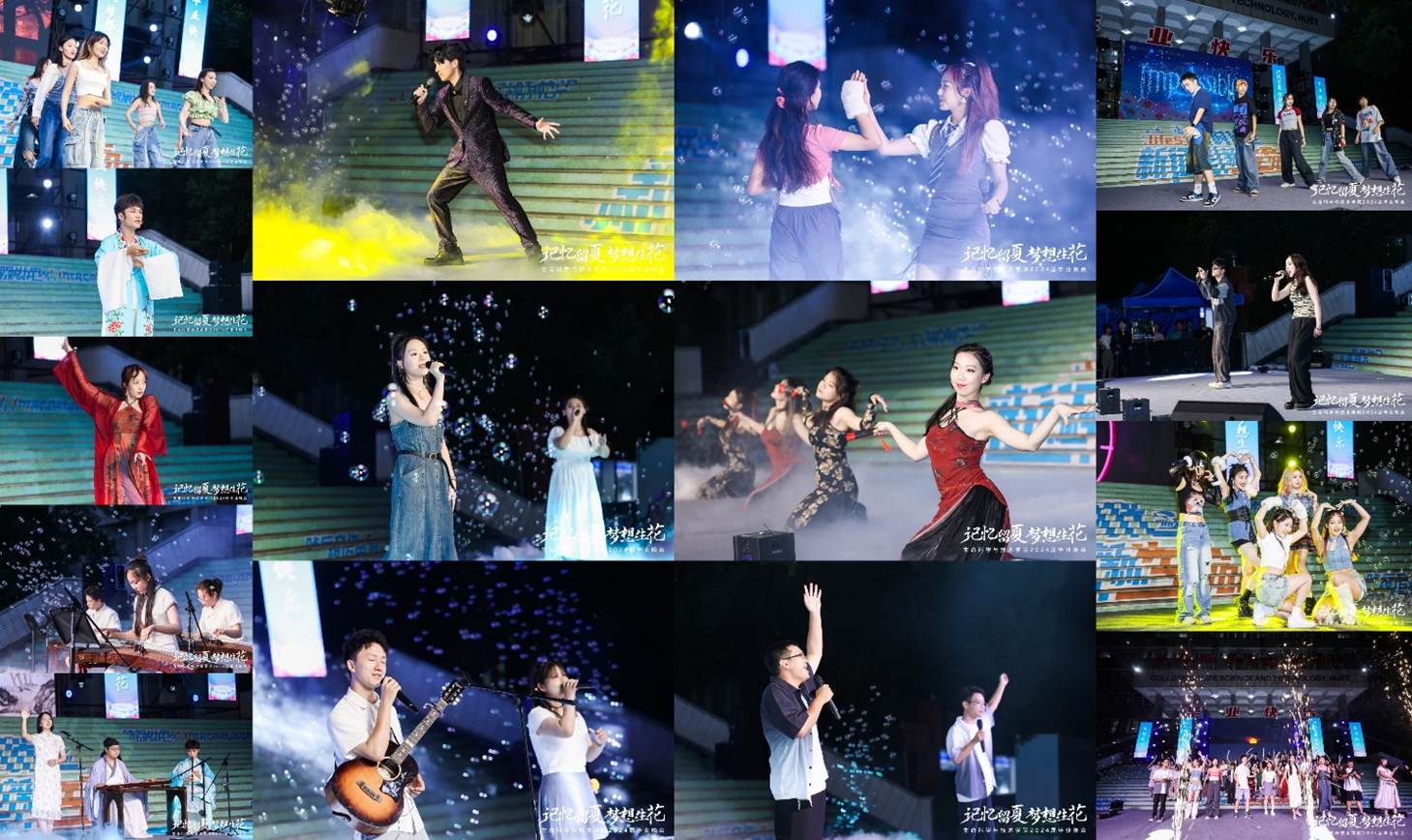 晚会以集体舞《Diamond》拉开序幕,表演者们用活力四射的音乐和舞蹈点燃现场。晚会分为“秋韵”、“冬谧”、“春熙”、“夏烁”四个篇章,以“秋韵”为序曲,戏歌《和项王歌》和舞蹈《告女子书》带领在场的老师和同学们轻启那千年流转的文化之门,在《弦歌四韵》和《阳关三叠》的韵律中,感受岁月的深沉与文化的厚重,聆听历史的回响。随后,晚会步入“冬谧”篇章,以静谧的冬夜为媒,回味往昔的温暖记忆。白雪穿过庭院的树木,化作片片飞花,洒落人间。从《交换余生》、《吻别&Take Me To Your Heart》和《伴》宁静而深情的演唱中,我们共同感受时光的温柔,仿佛那些温暖的记忆在心头轻轻荡漾。“春熙”的篇章如诗如画地绽放。万物复苏的春日,是青春的象征。春风得意,马蹄疾驰,我们一日看尽长安花的繁盛。歌曲《世界上的另一个我》、舞蹈《花间酒》以及歌曲《再遇见》带领全体师生感受生命的蓬勃朝气在每一寸土地上迸发。最后,晚会以“夏烁”为高潮,以夏日的炽热向未来致敬。舞蹈《Imposssible》、歌曲《攀登》、舞蹈《Antifragle》以及经典歌曲串烧大合唱《夏日回响》为全体2024届毕业生们带来一场盛夏狂欢。莲叶接天,荷花映日,夏的热烈如同梦想的火焰,照亮全体生命学子前行的道路。