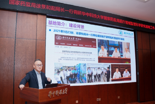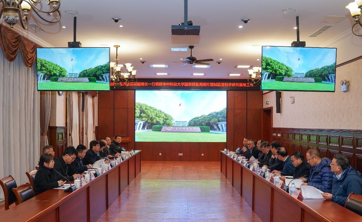 尤政对徐景和一行的来访表示欢迎,并对国家药监局给予公司的指导和支持表示感谢。他指出,华科大在医疗器械相关领域具有综合学科优势、雄厚研究基础和顶尖人才团队,在再生医学材料、高端医学成像及治疗装备等方面取得一批国际领先的创新成果。他期待基地继续发挥优势,加快推进医疗器械监管科学研究与人才培养,更好地服务“中国药品监管科学行动计划”,为我国医疗器械监管能力提升和产业高质量发展提供关键支撑。
